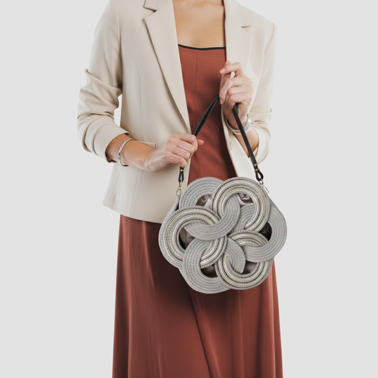 Özgün çiçek formu ve zarif detaylarıyla öne çıkan bu omuz çantası, pamuklu kordon ip kullanılarak makine dikişi ile özenle üretilmiştir.